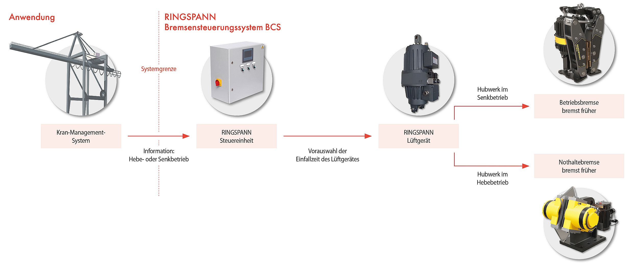 Der Flankenwechsel der Getriebezahnräder des Haupthubwerks ist ein Negativeffekt, der bei Notstopps auftritt. Zu beachten ist hierbei zunächst, dass die treibende Hebekraft der Motor ist, beim Senken aber die Last als treibende Kraft wirkt (der Motor kontrolliert dann nur die Bewegung und verhindert den freien Fall). Zur Eliminierung des Flankenwechsels ist nun sicherzustellen, dass beim Heben zuerst die Notstoppbremsen der Seiltrommel schließen, während die elektrohydraulischen Betriebsbremsen auf der Abtriebswelle des Motors beim Senken Vorrang haben. „Um dies zu erreichen, haben wir eine Stand-Alone-Lösung entwickelt, bei der die Steuerung des Krans nur die Information liefern muss, ob der Kran im Hebe- oder Senkbetrieb arbeitet. Alles weitere erledigen ein elektrohydraulisches Lüftgerät, das mit zwei voreingestellten Schließzeiten schließt, und eine Steuereinheit, die zuvor die jeweilige Schließzeit auswählt. Das System ist einfach integrierbar – sowohl in neue Krane als auch bei Nachrüstungen“, sagt Martin Ohler, Geschäftsentwickler Bremsen bei RINGSPANN.